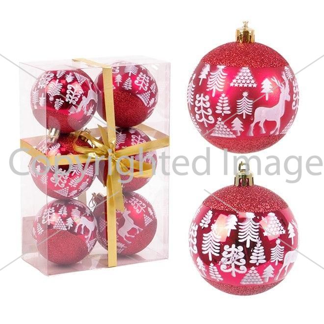 Набір пластикових ялинкових куль, колір червоний, 6 шт. діаметром – 7 см: матовий глітер з білим візерунком – 3 шт. глянсовий глітер з білим візерунком – 3 шт.