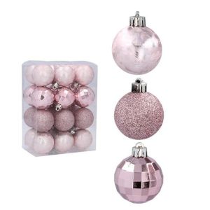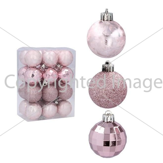 Набір пластикових ялинкових куль, колір рожевий, 24 шт. діаметром - 4 см: 6 шт. - глітер, 12 шт. - Матовий, 6 шт. - Фігурний.