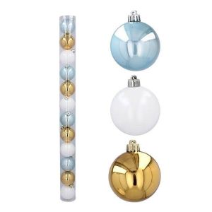 Набір пластикових ялинкових кульок, колір – білий матовий – 4 шт. золотий глянсовий – 4 шт. блакитний глянсовий – 4 шт. діаметром – 6 см.
