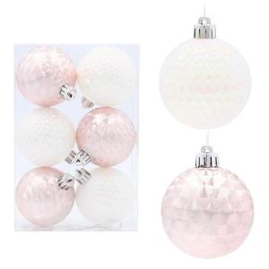 Набір пластикових ялинкових кульок, колір – рожевий фігурний – 3 шт. білий перламутровий – 3 шт. діаметром – 6 см.