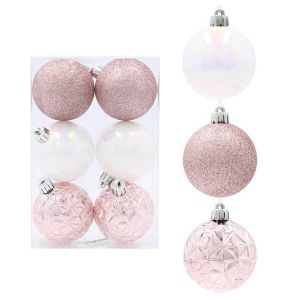 Набір пластикових ялинкових куль, колір – рожевий фігурний – 2 шт. білий перламутровий – 2 шт. рожевий глітер – 2 шт. діаметром – 6 см.