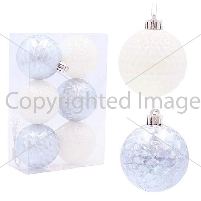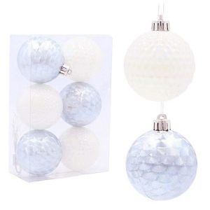 Набір пластикових ялинкових кульок, колір – фіолетовий фігурний – 3 шт. білий перламутровий – 3 шт. діаметром – 6 см.