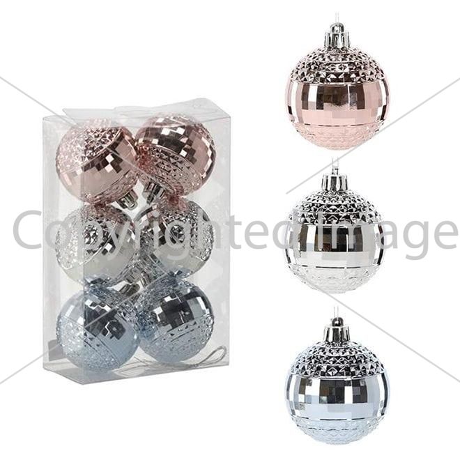 Набір пластикових ялинкових куль, колір – рожевий фігурний глянець – 2 шт. срібний фігурний глянець – 2 шт. блакитний фігурний глянець – 2 шт. діаметром – 6 см.
