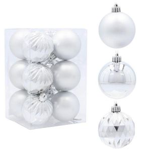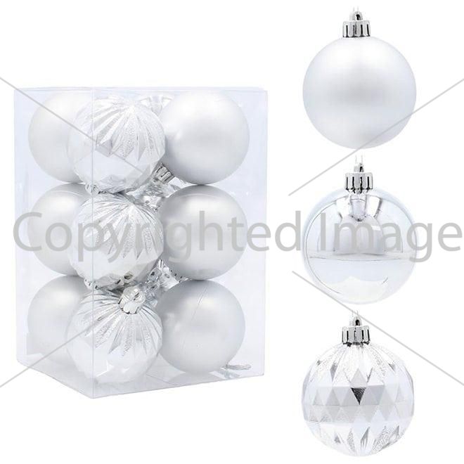 Набір пластикових ялинкових куль, колір срібний, 12 шт. діаметром - 6 см: 3 шт. - глянець, 3 шт. - Фігурний, 6 шт. - Матовий.