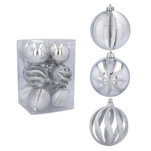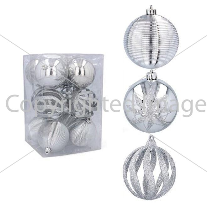 Набір пластикових ялинкових куль, колір срібний, 12 шт. діаметром - 8 см: 4 шт. - глянець з візерунком, 4 шт. - Глянсовий фігурний, 4 шт. - Фігурний гліттер.