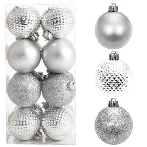 Набір пластикових ялинкових куль, колір срібний, 16 шт. діаметром – 6 см: фігурний глянсовий – 8 шт. матовий – 4 шт. глітер – 4 шт.