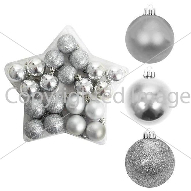 Набір пластикових ялинкових куль, колір срібний, 20 шт. діаметром - 4 см: 8 шт. - глянець, 8 шт. - глітер, 4 шт. - Матовий.