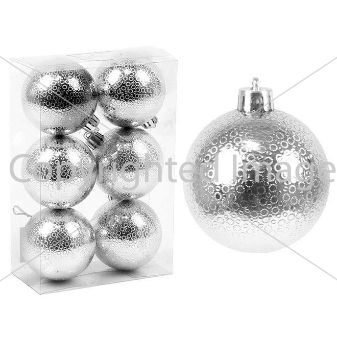 Набір пластикових ялинкових куль, колір срібний, 6 шт. діаметром - 6 см: 6 шт. - Глянсовий з візерунком.