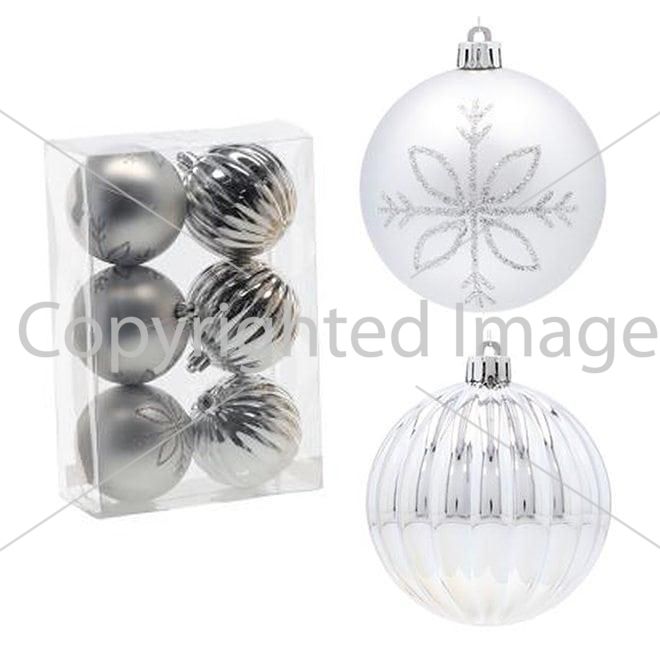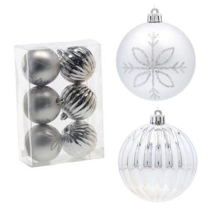 Набір пластикових ялинкових куль, колір срібний, 6 шт. діаметром - 8 см: 3 шт. - Фігурний глянець, 3 шт. - Матовий з візерунком.