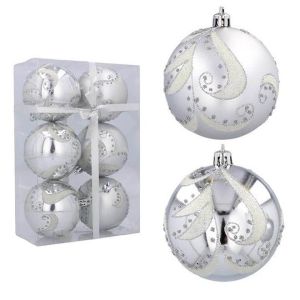 Набір пластикових ялинкових куль, колір срібний, 6 шт. діаметром - 8 см: 3 шт. - глянець з візерунком, 3 шт. - Матовий з візерунком.