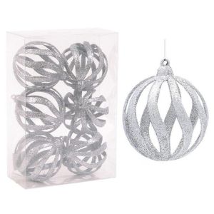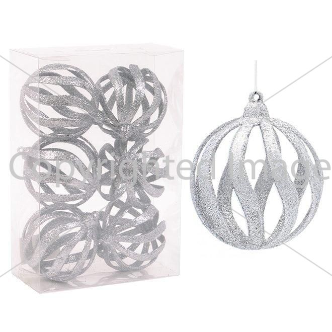 Набір пластикових ялинкових куль, колір срібний, 6 шт. діаметром - 8 см: 6 шт. - Фігурний гліттер.
