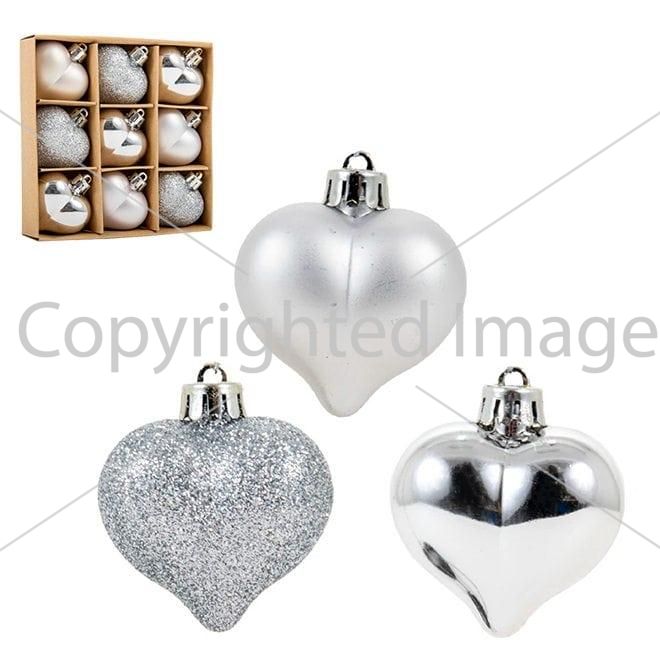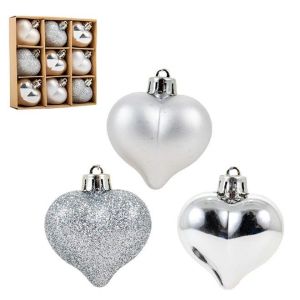 Набір пластикових прикрас ялинкових Серце, колір - срібний, 9 шт. діаметром - 4.5 см: 3 шт. - глянець, 3 шт. - Матовий, 3 шт. - Глітер.