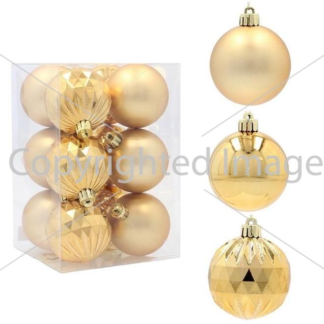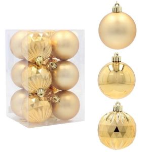 Набір пластикових ялинкових куль, колір золотий, 12 шт. діаметром - 6 см: 3 шт. - глянець, 3 шт. - Фігурний, 6 шт. - Матовий.