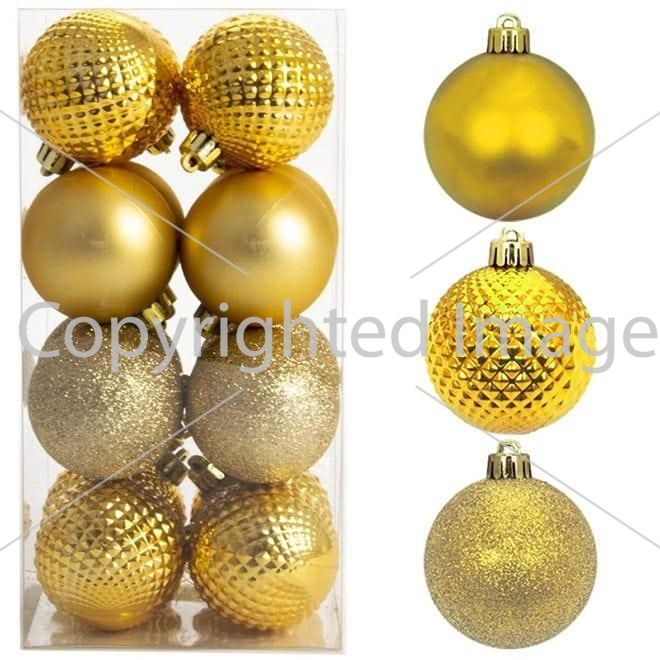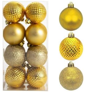 Набір пластикових ялинкових куль, колір золотий, 16 шт. діаметром – 6 см: фігурний глянсовий – 8 шт. матовий – 4 шт. глітер – 4 шт.