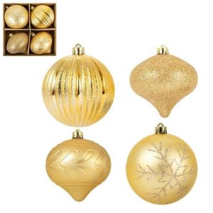 Набір пластикових ялинкових куль, колір золотий, 4 шт. діаметром – 10 см: фігурний глянсовий – 1 шт. фігурний матовий – 1 шт. матовий із візерунком – 1 шт. фігурний глітер – 1 шт.