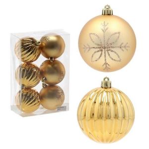 Набір пластикових ялинкових куль, колір золотий, 6 шт. діаметром - 8 см: 3 шт. - Фігурний глянець, 3 шт. - Матовий з візерунком.