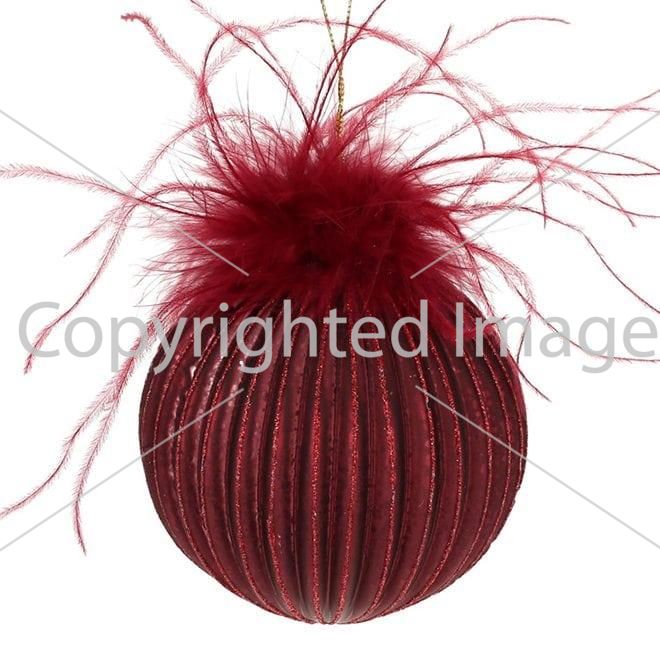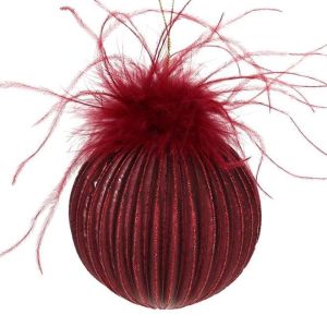 Набір скляних кульок рельєфної форми з декором з пір'я та глітера 8 см, колір - бордовий.