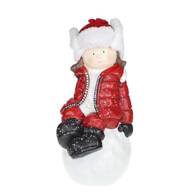 Новорічна фігурка дівчинка на сніжці у червоній куртці 45 см. Матеріал-кераміка.