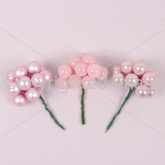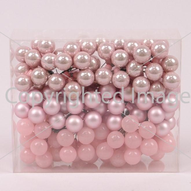 Скляні кульки рожевого кольору на дроті утворюють невеликий пучок, у ньому поєдналися 12 скляних кульок. В упаковці три види пучків. Такі маленькі скляні кульки обов'язково стануть у нагоді флористам і декораторам, зібравши їх у пучок і доповнивши гілками хвої, намистами, стрічками або іншим декором, вони створять унікальні новорічні прикраси!