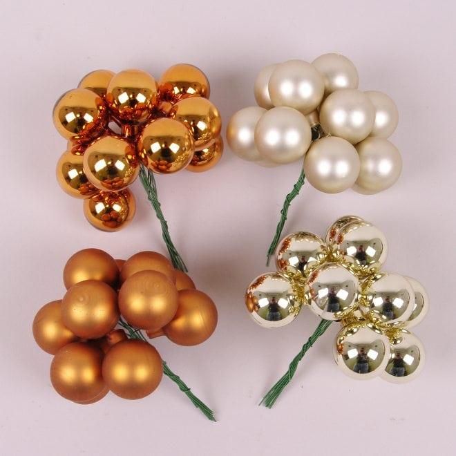 Скляні кульки коричневого-шампанья кольору на дроті утворюють невеликий пучок, у ньому з'єдналися 12 скляних кульок. В упаковці чотири види пучків. Такі маленькі скляні кульки обов'язково стануть у нагоді флористам і декораторам, зібравши їх у пучок і доповнивши гілками хвої, намистами, стрічками або іншим декором, вони створять унікальні новорічні прикраси!