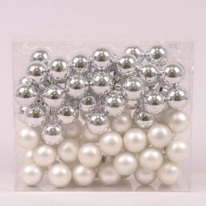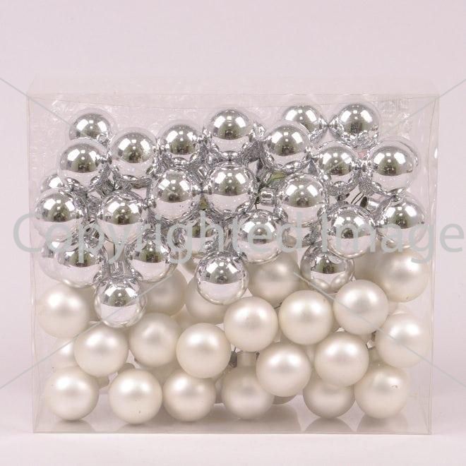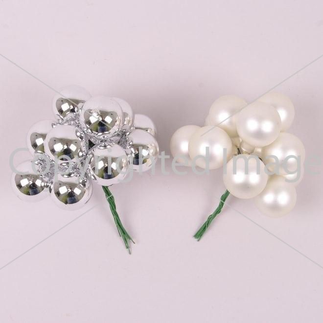 Скляні кульки срібного кольору на дроті утворюють невеликий пучок, у ньому з'єдналися 12 скляних кульок. В упаковці два види пучків 3 з матовими кульками та 3 з глянсовими. Такі маленькі скляні кульки обов'язково стануть у нагоді флористам і декораторам, зібравши їх у пучок і доповнивши гілками хвої, намистами, стрічками або іншим декором, вони створять унікальні новорічні прикраси!