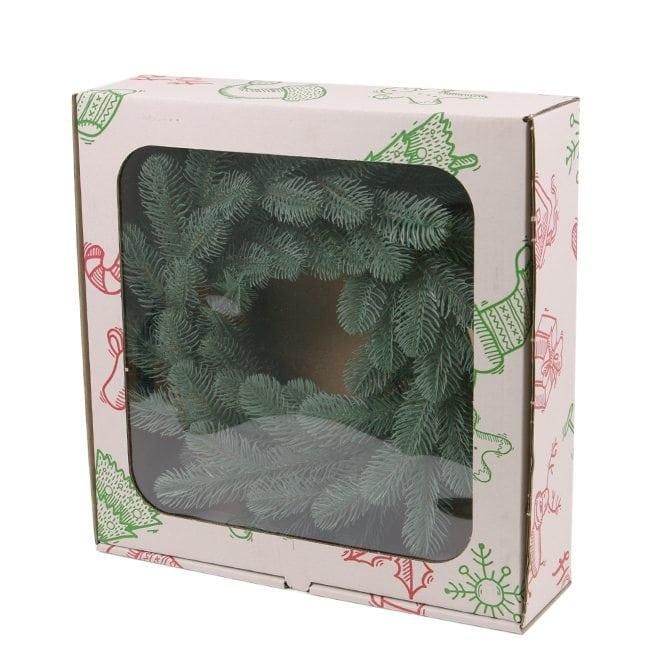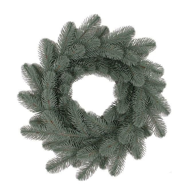 Штучний литий вінок виконаний із максимальною реалістичністю. Хвоя гілок виготовлена з харчового пластику. Гілочки відливаються в спеціальних формах. Він виглядає як жива справжня ялина. Упаковується у коробку.